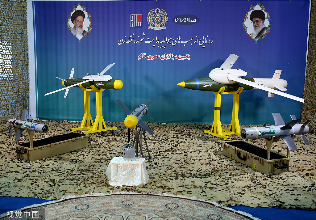 当地时间2019年8月6日,伊朗德黑兰,伊朗国防部长哈塔米当天在德黑兰的推介仪式上,介绍了该部与伊朗电子工业公司共同开发的三种新型导弹。图源:视觉中国