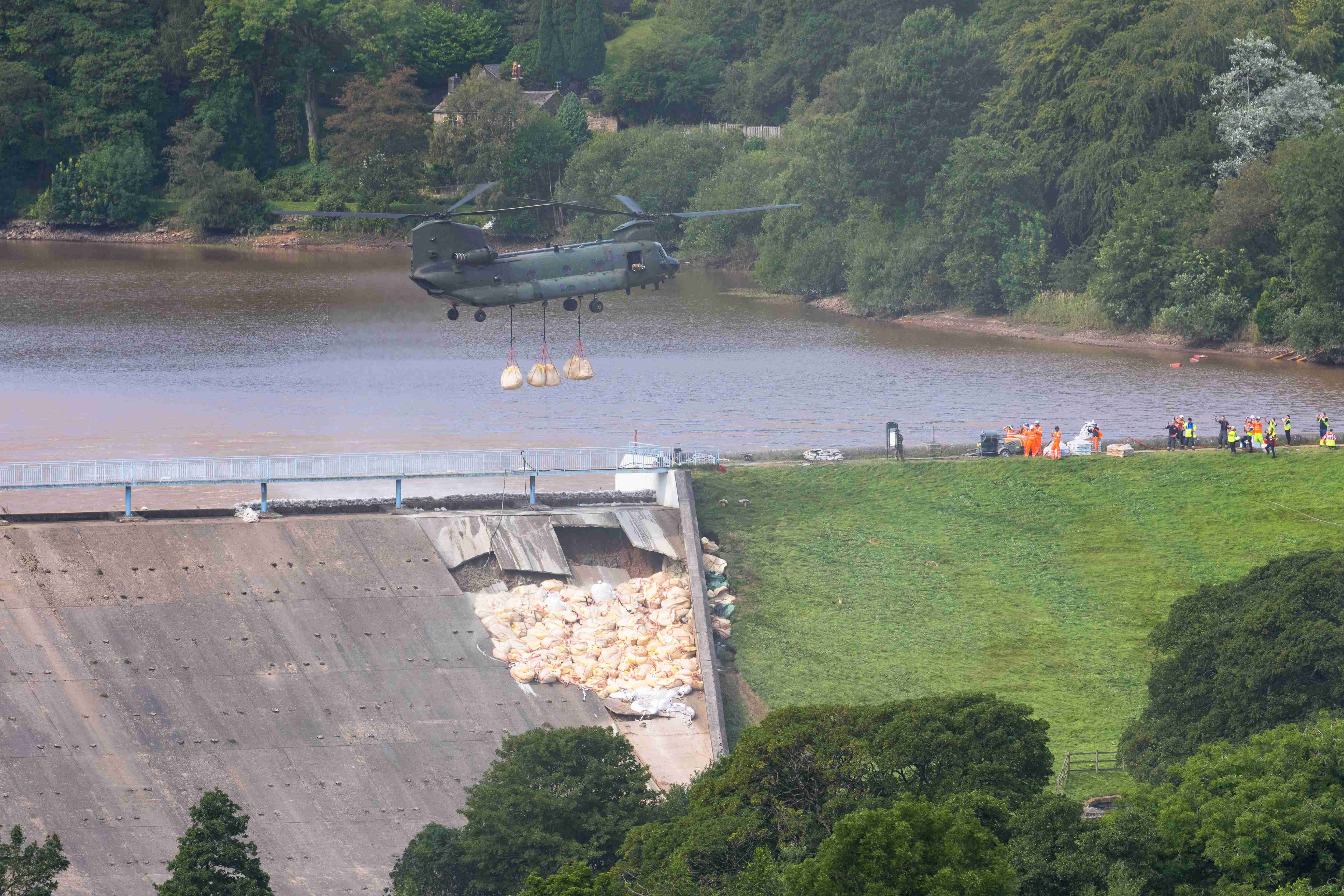 目前,英国军方派出运输直升机加紧作业,将装满沙砾碎石的袋子运送到大坝坍塌处,进行填补和加固,并对水库进行排水泄洪。 位于下游的惠利布里奇镇居民受溃坝风险威胁不得不撤离家园。目前,这些撤离居民已经在外度过了五天。图源:IC photo