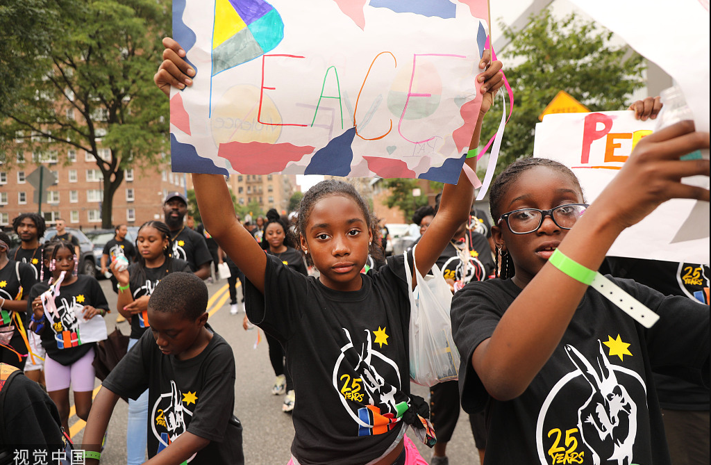 当地时间2019年8月7日,美国纽约,当地儿童参加年度儿童和平游行,学生、家长、社区工作人员走上街头,谴责各种形式的暴力行为。图源:视觉中国