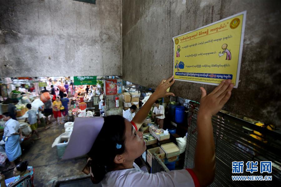 8月8日,在缅甸仰光的一个市场,一名护士张贴预防甲型H1N1流感宣传单。 缅甸卫生部门公布的最新数据显示,自今年6月以来至本月7日,缅甸全国已有422人确认感染甲型H1N1流感病毒,其中90人死亡。 新华社发(吴昂摄)