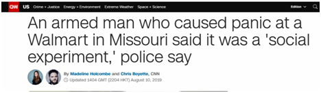 当地时间8日,一名身穿防弹衣、手持“战术武器”、“全副武装”的白人男子穿着迷彩服走进美国密苏里州的一家沃尔玛超市。这名男子还拍摄自己推着手推车穿过商店,其他购物者惊慌地四散而逃的场景。所幸,此人没有开枪射击,最终被赶来的警察逮捕。