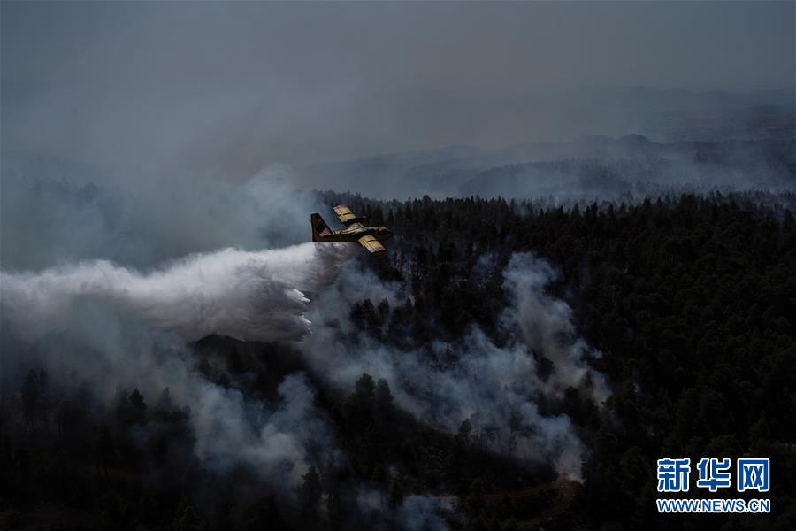 8月14日,在希腊埃维亚岛马克里马利村附近,一架飞机参与山火扑救。新华社发(尼克·帕莱奥洛戈斯摄)