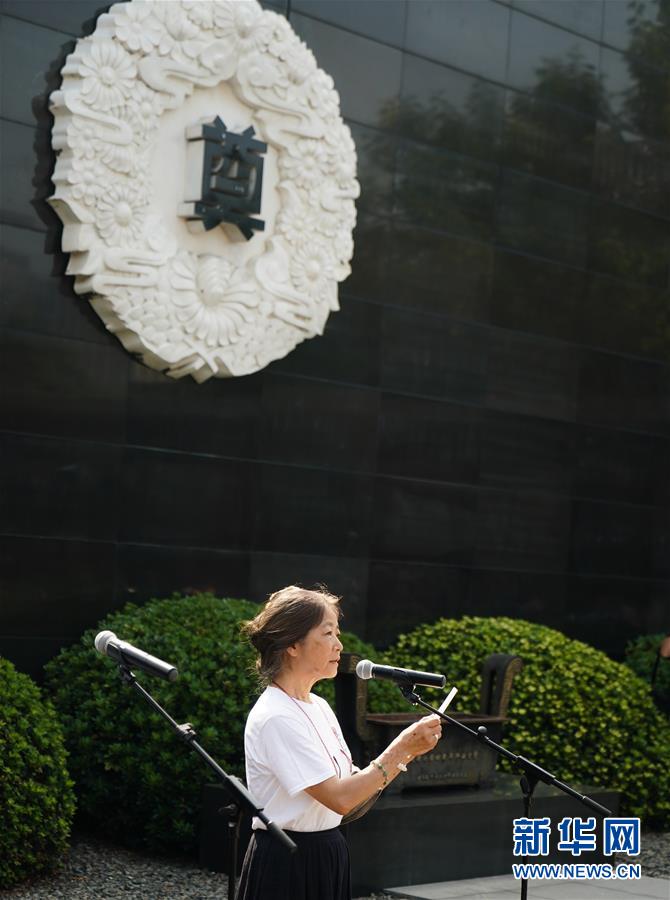 8月15日,在侵华日军南京大屠杀遇难同胞纪念馆祭场内,日本神户·南京心连心会第23次访华团团长宫内阳子在集会上发言。 当日,在中国人民抗日战争胜利74周年之际,包括日本神户·南京心连心会第23次访华团成员在内的十余个国家的代表,一同在侵华日军南京大屠杀遇难同胞纪念馆举行国际和平集会,悼念南京大屠杀遇难者,祈祷世界和平。 新华社记者 季春鹏 摄