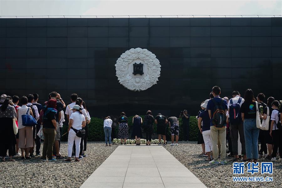 8月15日,在侵华日军南京大屠杀遇难同胞纪念馆祭场内,人们在悼念南京大屠杀遇难者。 当日,在中国人民抗日战争胜利74周年之际,包括日本神户·南京心连心会第23次访华团成员在内的十余个国家的代表,一同在侵华日军南京大屠杀遇难同胞纪念馆举行国际和平集会,悼念南京大屠杀遇难者,祈祷世界和平。 新华社记者 季春鹏 摄