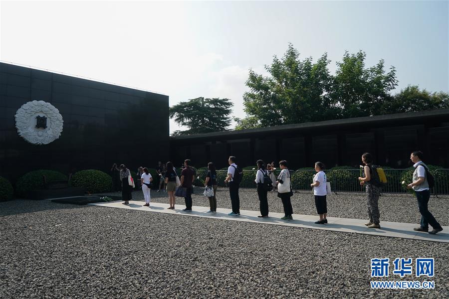 8月15日,人们在侵华日军南京大屠杀遇难同胞纪念馆祭场内悼念南京大屠杀遇难者。 当日,在中国人民抗日战争胜利74周年之际,包括日本神户·南京心连心会第23次访华团成员在内的十余个国家的代表,一同在侵华日军南京大屠杀遇难同胞纪念馆举行国际和平集会,悼念南京大屠杀遇难者,祈祷世界和平。 新华社记者 季春鹏 摄