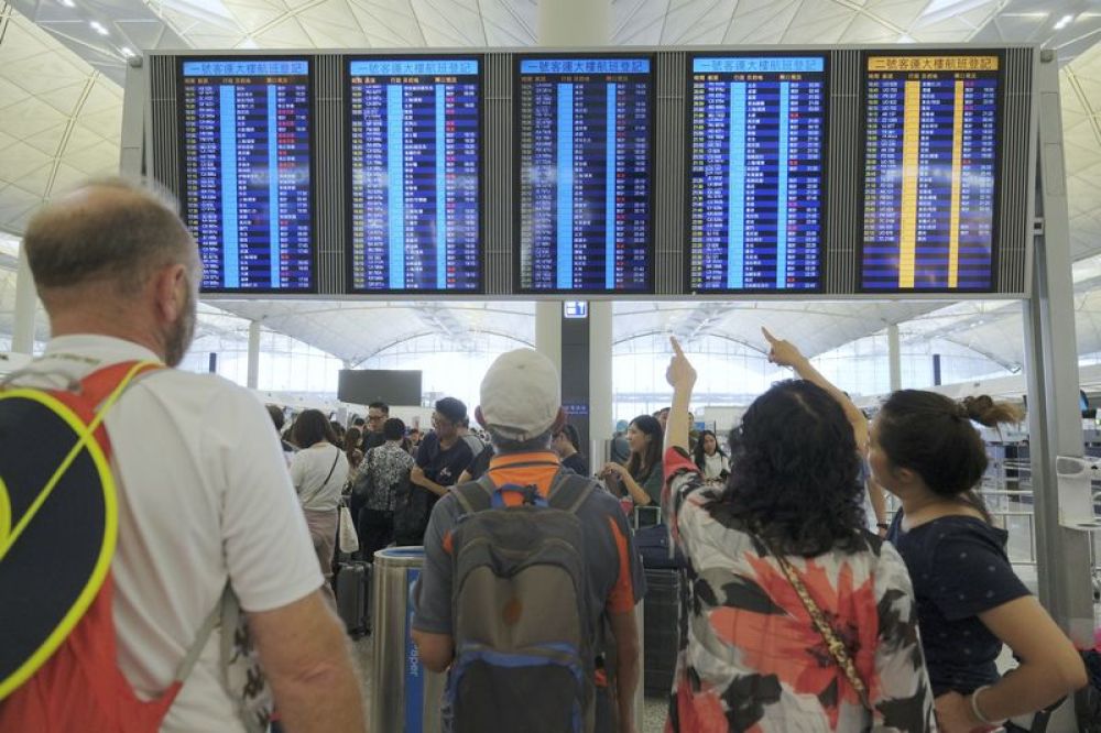 8月14日,旅客在香港国际机场离港大堂办理相关手续。新华社记者 王申 摄