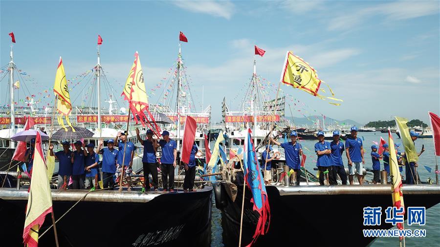 8月16日,准备出海的渔民们向岸上的亲友与宾客打招呼。 8月15日至16日,第17届南海(阳江)开渔节于在广东阳江海陵岛举行。今年的南海休渔期也在16日正式结束,这一天,渔民们再次开始了在渔船上的辛勤劳作,向广阔的大海进发。 新华社记者 周自扬 摄