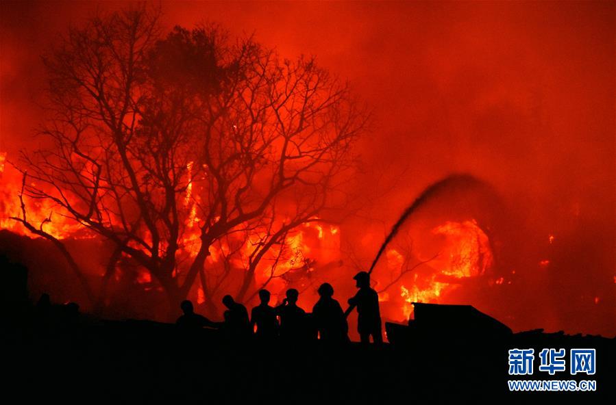 8月16日晚,在孟加拉国首都达卡,消防员用高压水枪灭火。新华社发