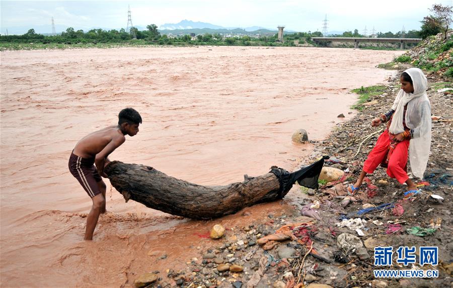 8月17日,在印控克什米尔查谟郊外,人们在涨水的达维河岸收集木柴。 印控克什米尔地区受每年6月至9月的季风雨季影响,雷电暴雨天气频发,洪水及泥石流等灾害经常发生。 新华社发