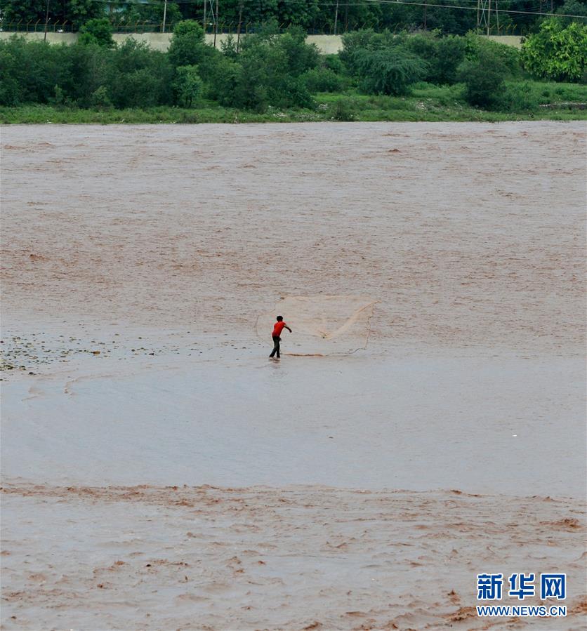 8月17日,在印控克什米尔查谟郊外,渔夫在涨水的达维河捕鱼。 印控克什米尔地区受每年6月至9月的季风雨季影响,雷电暴雨天气频发,洪水及泥石流等灾害经常发生。 新华社发