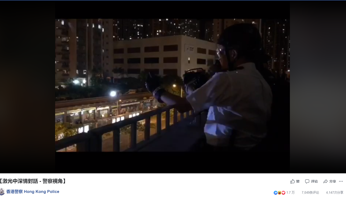 据香港“橙新闻”19日报道,香港警方上周六在社交媒体脸书专页上传“激光中深情对话——警察视角”的视频,该视频是从警署内的角度进行拍摄。视频显示,林景升先是通过扬声器对那些用镭射枪射向警方的滋事者说:“没错,是你,不需要藏起来,做得出来就别怕承认”,并劝其“悬崖勒马,给自己一个机会,想想养育你的父母,我请你现在离开,看看自己手机通讯录有哪些人,未来五年你是不是真的想和这些人失去联络?”