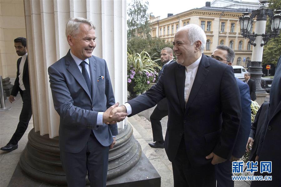 8月19日,在芬兰赫尔辛基,芬兰外长哈维斯托(前左)欢迎伊朗外长扎里夫(前右)到访。正在芬兰访问的伊朗外长扎里夫19日在赫尔辛基表示,伊朗仍然遵守现有的伊朗核问题全面协议,并愿与有关方面开展对话。新华社发(马蒂·马蒂凯宁摄)