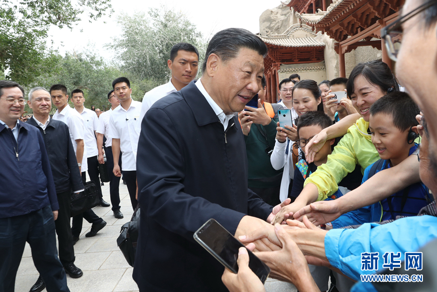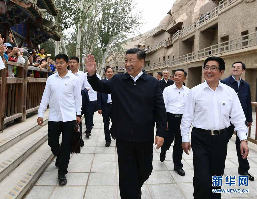 习近平在敦煌莫高窟考察调研时,向正在参观的游客亲切招手致意。