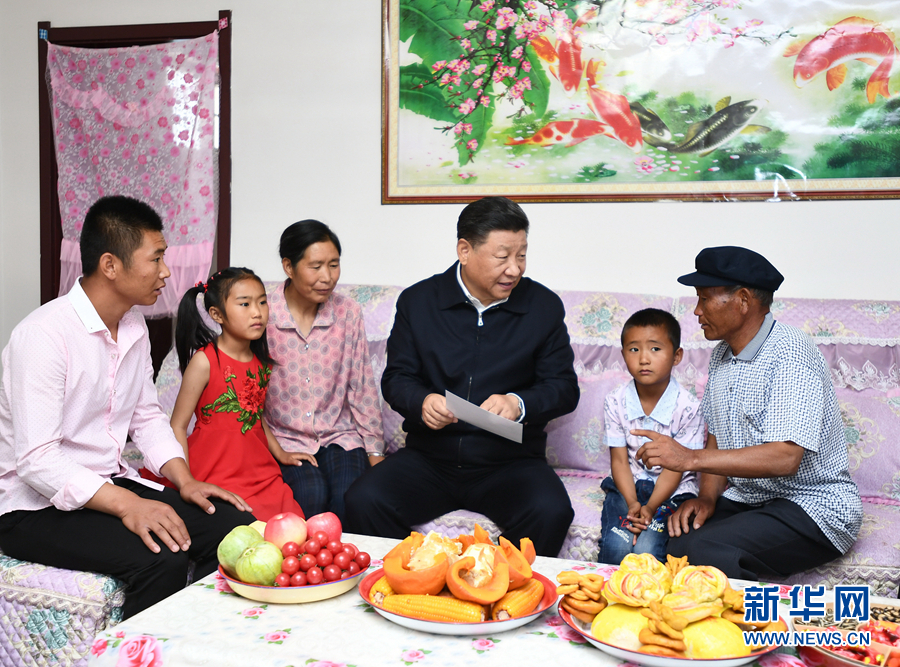 习近平在武威市古浪县黄花滩生态移民区富民新村村民李应川家,同李应川一家拉家常。