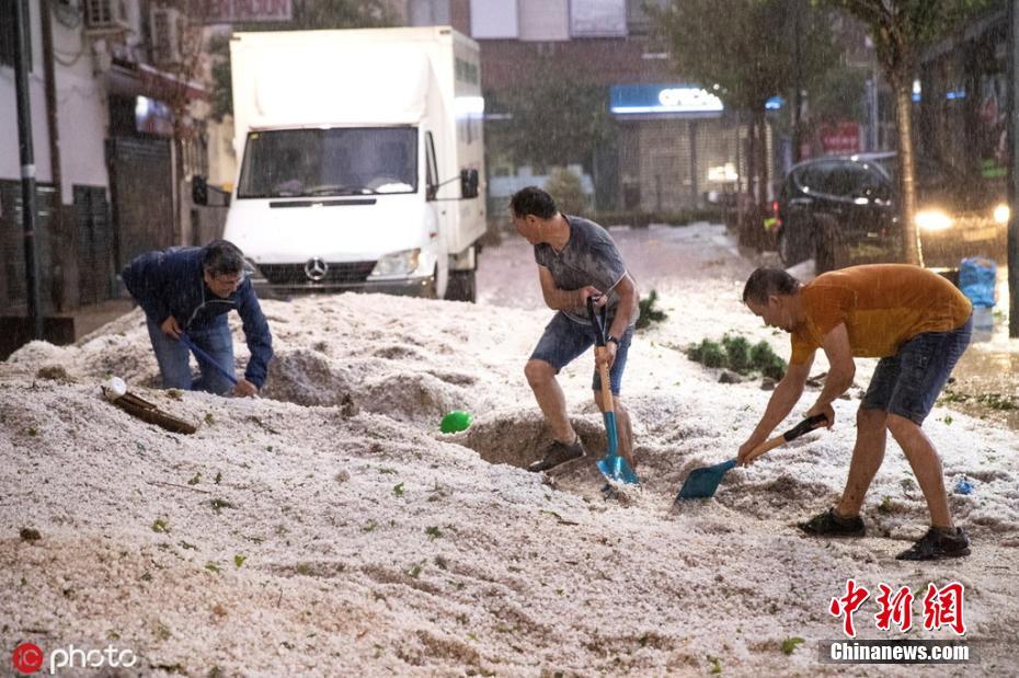 当地时间8月26日,西班牙马德里,西班牙气象局发布橙色预警,当地遭大雨和冰雹袭击。图片来源:Icphoto