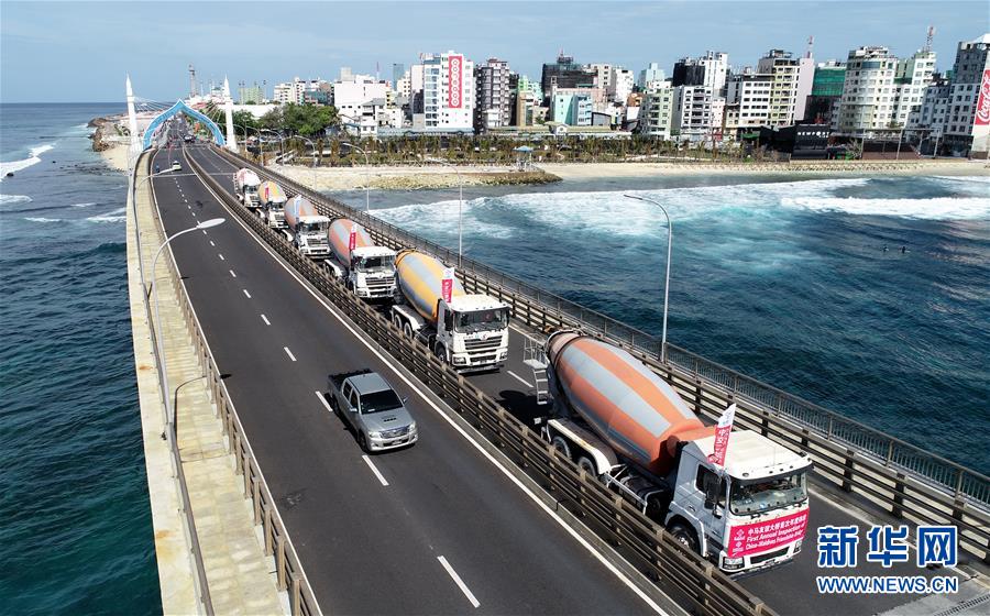 这是8月30日在连接马尔代夫首都马累和机场岛的中马友谊大桥拍摄的对大桥进行荷载试验的工程车辆。 新华社发(王明亮摄)