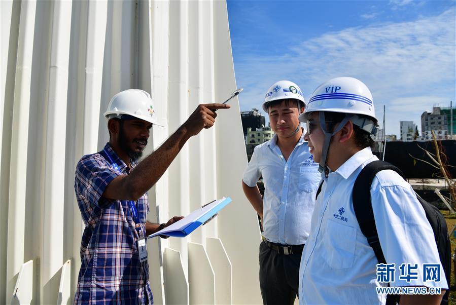 8月30日,在连接马尔代夫首都马累和机场岛的中马友谊大桥上,马尔代夫工程师穆罕默德·沙菲尤(左)与中方工程师讨论大桥检测结果。 新华社发(杜才良摄)