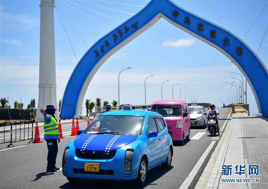 8月30日,在连接马尔代夫首都马累和机场岛的中马友谊大桥上,当地女交警阿丽娜引导车辆通行。  新华社发(杜才良摄)