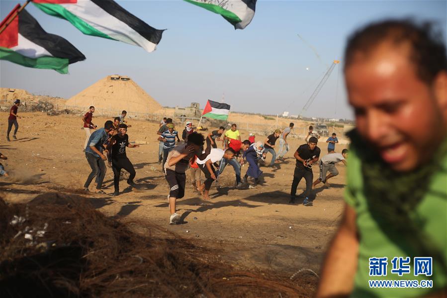 8月30日,在加沙地带南部汗尤尼斯与以色列交界处,巴勒斯坦示威者躲避催泪弹。 巴勒斯坦加沙地带卫生部门30日说,加沙地带民众当天与以色列士兵发生冲突,至少75名巴勒斯坦人在冲突中受伤。 新华社发(哈立德·奥马尔摄)