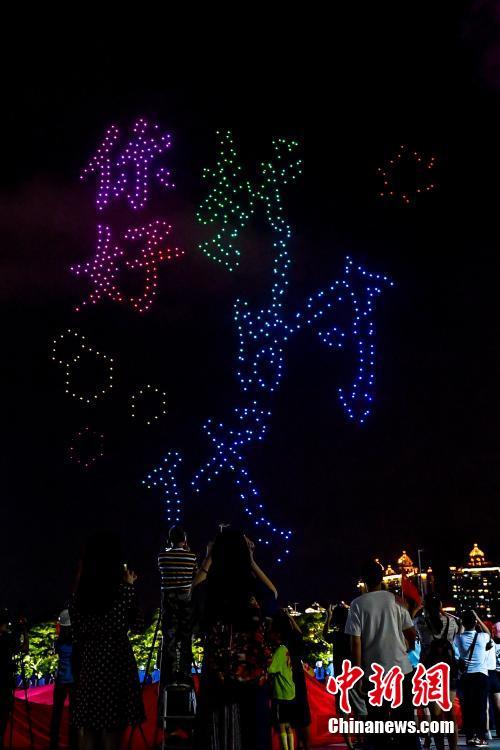8月30日晚,广州花城广场上空,999架无人机组成的编队与广州塔灯光秀配合,变换出五星红旗、港珠澳大桥、时钟、“70” “你好新时代” “我爱你中国”等不同图案和文字。