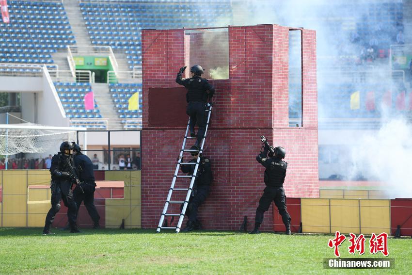 9月2日,长春市公安局在长春经开体育场举行2019年全警实战练兵活动。在安保反恐演练环节,全体参战警力快速反应、高效处置,整个演练环节紧扣,局面紧张,对抗激烈,场景震撼。在全警实战练兵环节中,共进行了24个大项41个子项的警务技能和警体项目竞逐。张瑶 摄
