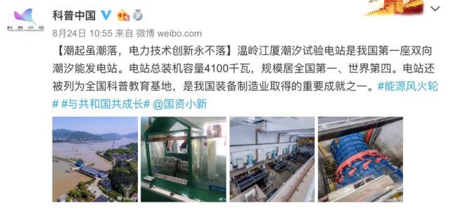 温岭江厦潮汐试验电站总装机容量4100千瓦,是目前我国最大、世界第四的潮汐能发电站。该电站的投产发电还作为发生在20世纪的世纪性大事,被镌刻在北京中华世纪坛的青铜甬道铭文中,备受瞩目。
