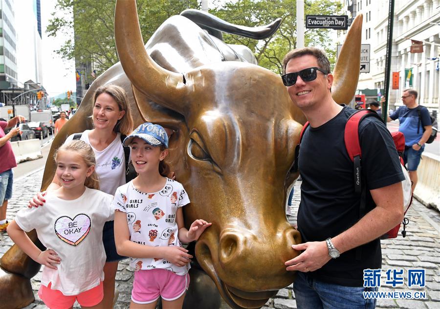 9月9日,在美国纽约,游客在华尔街铜牛前留影。新华社记者李睿摄