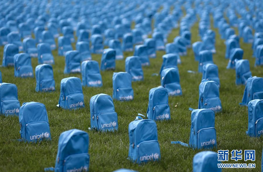 这是9月10日在纽约联合国总部拍摄的联合国儿童基金会制作的装置艺术作品,3758只蓝色书包象征了2018年在世界各冲突地区丧生的儿童。新华社记者 李木子 摄