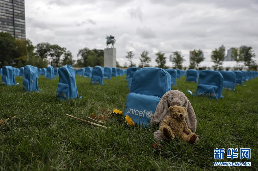 这是9月10日在纽约联合国总部拍摄的联合国儿童基金会制作的装置艺术作品,3758只蓝色书包象征了2018年在世界各冲突地区丧生的儿童。新华社记者 李木子 摄