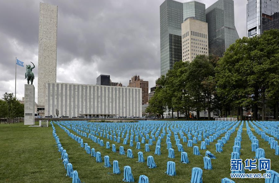这是9月10日在纽约联合国总部拍摄的联合国儿童基金会制作的装置艺术作品,3758只蓝色书包象征了2018年在世界各冲突地区丧生的儿童。新华社记者 李木子 摄
