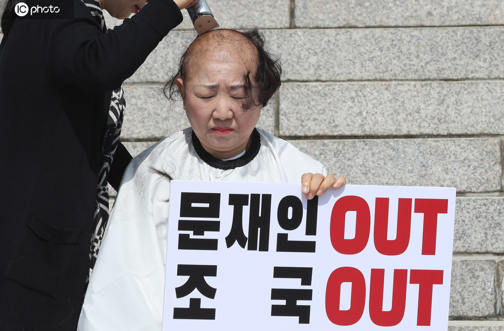 当地时间2019年9月11日,韩国首尔,两名韩国女议员在国会大楼前剃光头,抗议新法务部长官的任命,呼吁政府撤回任命,要求文在寅公开道歉。曹国先前是文在寅政府的青瓦台民政首席秘书,在获得法务部长官提名后,他和家人被曝涉及多件丑闻,包括帮助女儿“走后门”入读名校。但文在寅仍然坚持这项任命。图源:东方IC