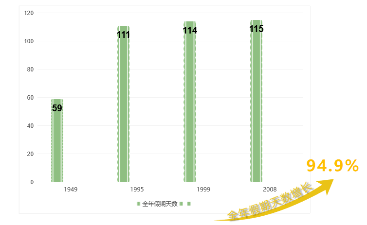 从1949年开始每周单休,到1995年实施双休制;从1999年10月1日起,每年国庆、春节、“五一”三个假日实行7天的连续休假制度,到2008年在保留国庆和春节两个“黄金周”基础上,“五一”放假3天并增加清明、端午、中秋三个“小长假”——新中国成立70年以来,全年假期从59天增加至115天,法定节假日从4个变为7个。中国人真正有“闲”了。