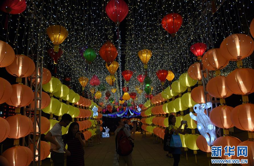 9月11日,市民和游客在香港维多利亚公园中秋彩灯会上观赏彩灯。 新华社记者 卢炳辉 摄
