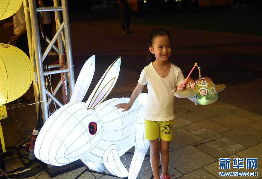 9月11日,在香港维多利亚公园中秋彩灯会上,小朋友与动物造型彩灯合影。 新华社记者 卢炳辉 摄