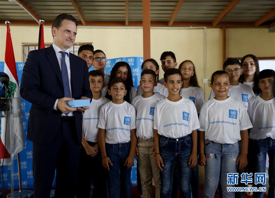 9月12日,在黎巴嫩首都贝鲁特南部的耶尔穆克联合国近东巴勒斯坦难民救济和工程处(近东救济工程处)学校,近东救济工程处总干事皮埃尔·克朗恩布尔(左)参加开学典礼。新华社发(比拉尔·贾维希摄)