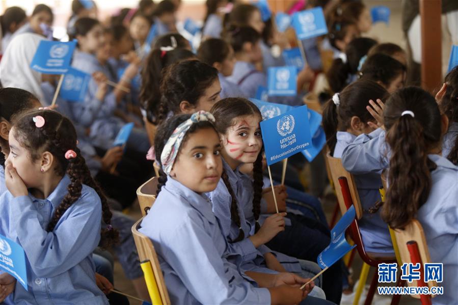 9月12日,在黎巴嫩首都贝鲁特南部的耶尔穆克联合国近东巴勒斯坦难民救济和工程处学校,学生们参加开学典礼。当日,在黎巴嫩首都贝鲁特南部的耶尔穆克联合国近东巴勒斯坦难民救济和工程处学校举行开学典礼,巴勒斯坦难民儿童迎来开学季。新华社发(比拉尔·贾维希摄)