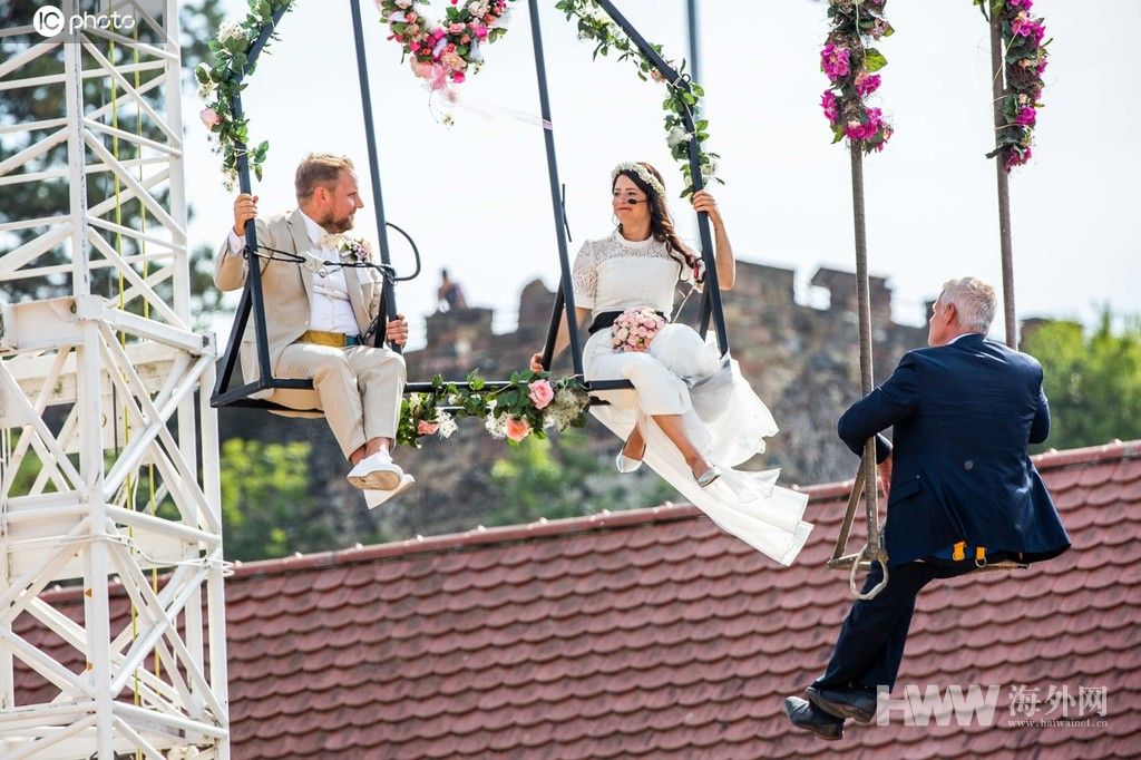 当地时间2019年9月14日,德国巴登-符腾堡州,当地一对情侣在空中举行了婚礼。(图:东方IC)
