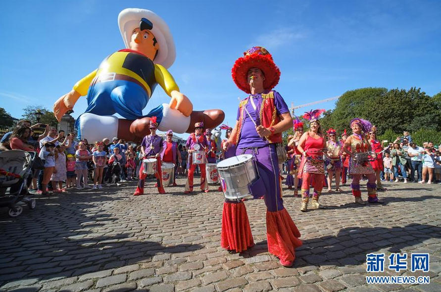9月15日,人们在比利时首都布鲁塞尔观看卡通气球大巡游。 当日,布鲁塞尔举行第十届布鲁塞尔漫画节卡通气球大巡游,形态各异的卡通气球从街头巷尾穿行而过,吸引大批市民和游客。 新华社记者 郑焕松 摄