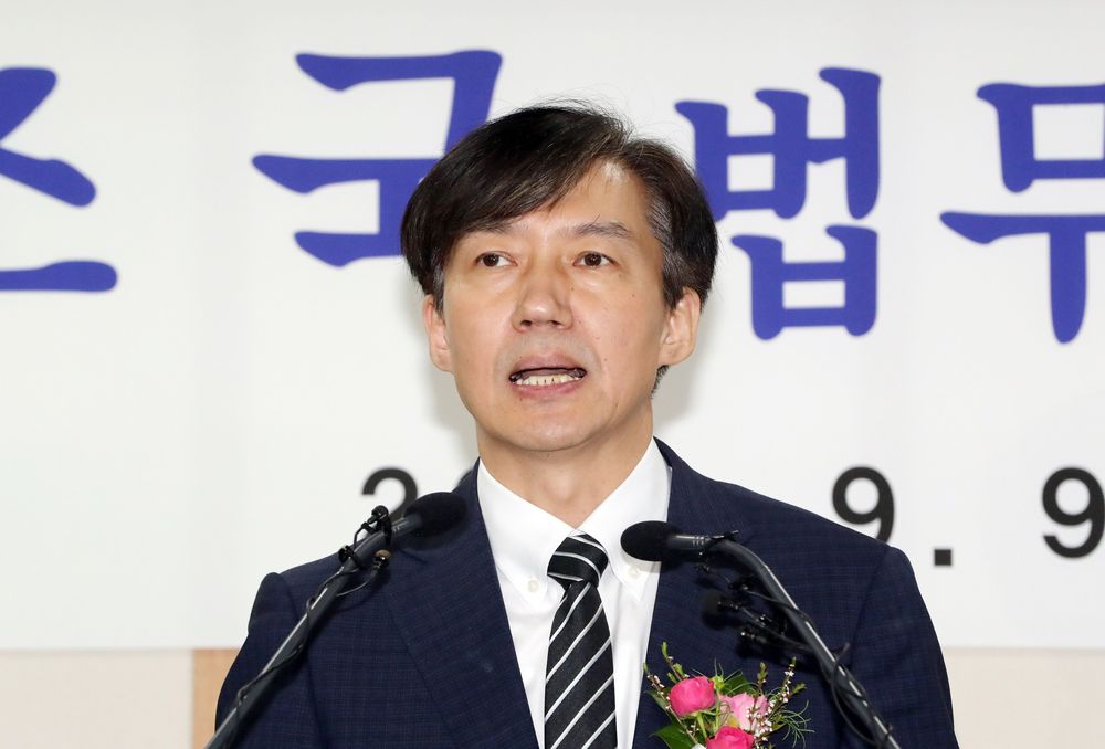9月9日,在韩国果川,新任法务部长官曹国在任命仪式上发表讲话。新华社/法新