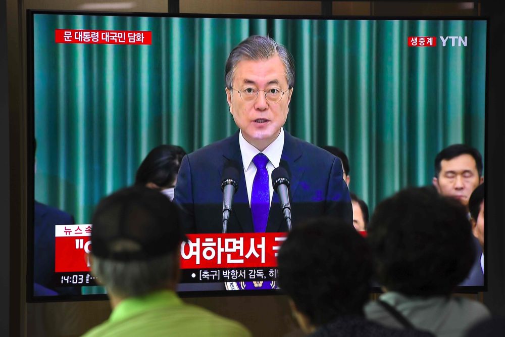 9月9日,在韩国首尔,民众观看电视中关于韩国总统文在寅任命政府官员的报道。新华社/法新