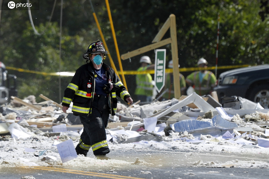 当地时间2019年9月16日,美国缅因州法明顿市,一栋建筑发生爆炸,造成一名消防员丧生,另有多人受伤。据美国媒体报道,事发建筑是一栋低层办公楼,地下室有存储丙烷的气罐。当天楼内出现气味后,人员已全部疏散。消防人员接到报警后赶到现场进行检查时发生爆炸。现场画面显示,该建筑已完全损毁。(图:东方IC)