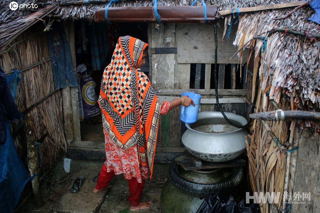 2019年9月17日报道(拍摄时间不详),孟加拉国萨德基拉,孟加拉国是最容易受到气候变化影响的国家之一,由于气候变化,孟加拉国长期遭受了热带气旋、洪水、山体滑坡和干旱等严重的自然灾害,且这些灾害的强度和频率都将随着气候的变化而增加,这使得孟加拉国的饮水危机也不断加深,雨水甚至成为了一些村庄的主要饮水来源。