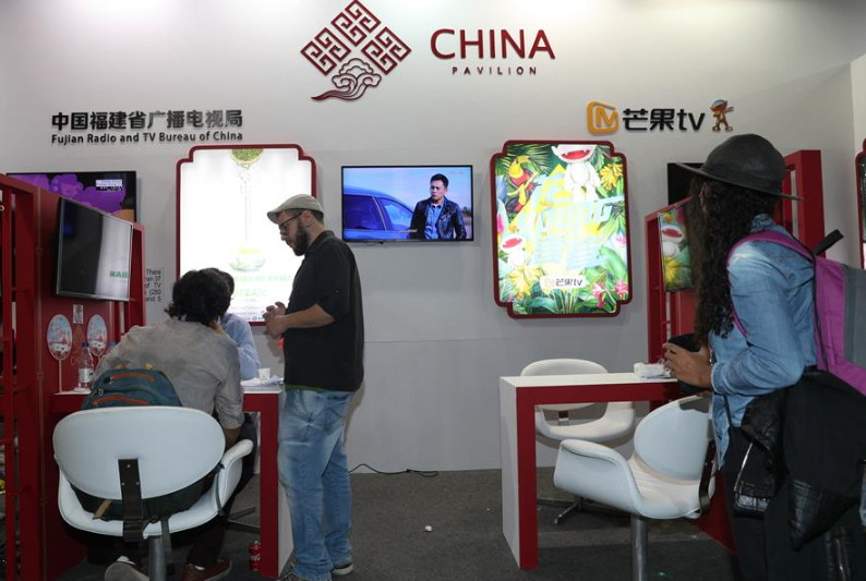 2019年4月24日,在巴西里约热内卢艺术城,与会者在中国展台咨询。中国联合展台当日在2019里约创意大会期间举办中国影视产品专场推介会,引起巴西传媒界的关注。 新华社记者李明摄