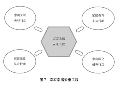 重视发挥妇女在家庭文明建设中的独特作用。中国重视发挥妇女在弘扬家庭美德、树立良好家风方面的独特作用。从20世纪50年代全国城乡普遍开展的“五好家庭”评选活动,到改革开放后开展的具有鲜明时代特征的美好家庭、五好文明家庭、绿色家庭、平安家庭、和谐家庭、文明家庭等各类家庭文明建设活动,广大妇女积极响应参与,推动男女平等、夫妻和睦、尊老爱幼等家庭文化发展,倡导绿色环保、文明健康的生活方式,使家庭成为社会平安与和谐的起点,用榜样力量引领家庭见贤思齐、崇德向善,追求和谐平安幸福生活。党的十八大以来,更加重视发挥家庭在传承美德、涵养家风、立德树人等方面的重要作用。2014年,妇联组织开展寻找“最美家庭”活动以来,广大妇女踊跃参加,推动社会主义核心价值观在家庭落细落小落实,把家教家风家训送到千家万户,以好的家风支撑起好的社会风气。截至2018年底,累计4.85亿人次参与线上线下寻找“最美家庭”活动,涌现出各级各类“最美家庭”380多万户。1997—2018年,表彰全国“五好家庭”8800多户。2016年开始,各级工会女职工组织开展“培育好家风——女职工在行动”主题实践活动。2019年,妇联组织启动实施“家家幸福安康工程”(图7),积极回应广大妇女和亿万家庭新时代的新需求,以小家庭的和谐共建大社会的和谐,推动形成家家幸福安康的生动局面。