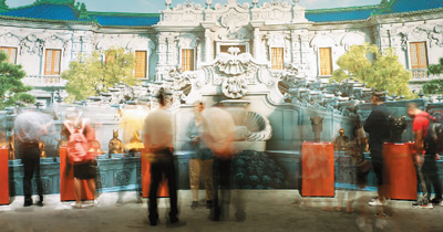 在圆明园海晏堂喷绘背景下,6个朱红展柜里,分别陈列着牛首、虎首、猴首、猪首、鼠首和兔首铜像。这些兽首铜像原为海晏堂十二生肖喷泉构件,1860年英法联军劫掠圆明园后流失海外。时隔159年,它们又重聚一堂,诉说着辗转曲折的回归之路,同时也见证着中华国运的沧桑巨变。