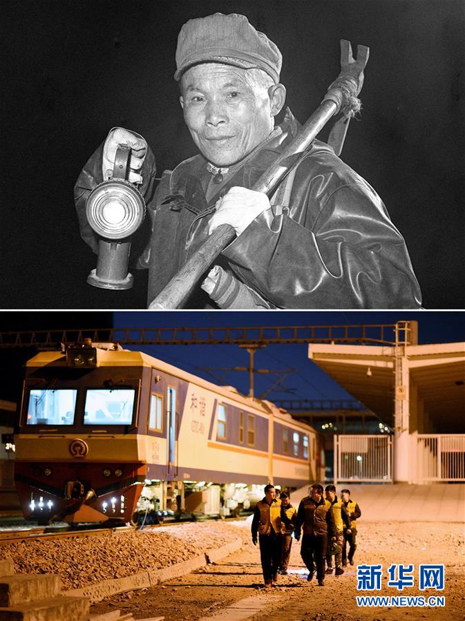 拼版照片:上图为1977年,河南郑州铁路局信阳分局孝子店养路工区巡道工芦利连在夜间巡道(新华社记者樊鸣涛摄);下图为2019年1月21日,中国铁路郑州局集团有限公司郑州工务机械段的钢轨探伤工准备出乘作业(新华社记者李安摄)。