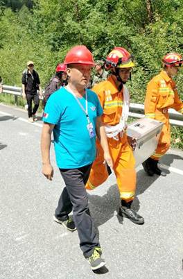 2017年,映秀镇中滩堡村党支部书记杨云兵带领干部群众赶往九寨沟抗震救灾。受访者供图