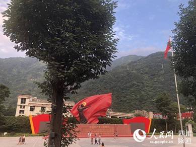 初秋时节,汶川映秀镇流水潺潺,鸟语花香。来往游客、小镇街景及远处苍翠的山峰,共同构成一幅祥和安宁的山水画卷。