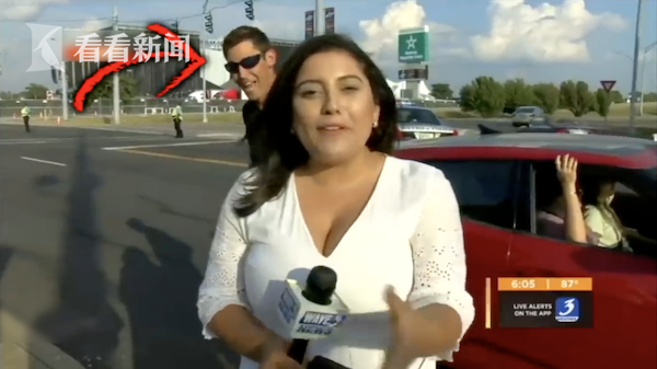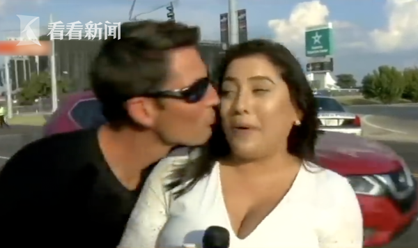 美国一名记者在街头新闻直播时遇到一件非常尴尬的事情。直播中,一名陌生男子突然闯入镜头,对着女记者的脸颊就是一个吻。