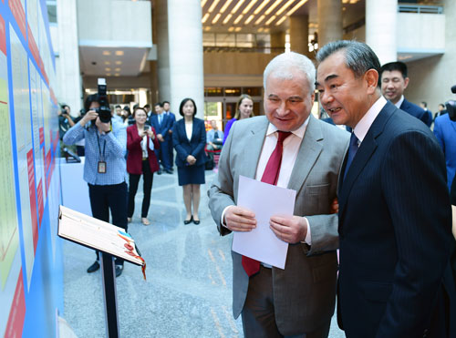 随后,王毅国务委员兼外长同杰尼索夫大使等共同参观了档案文献展。此次展览通过60多份珍贵档案文献、图表和实物,展现了中俄关系发展的历史进程和取得的重要成果。